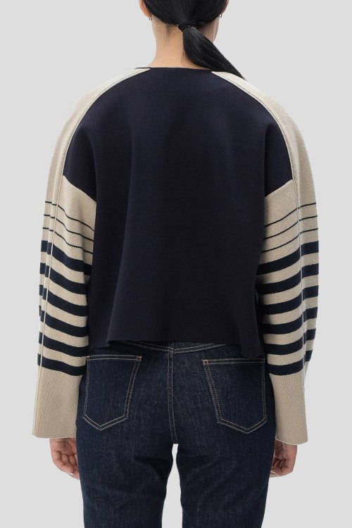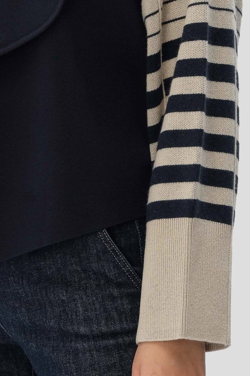 Детали: Женский темно-синий трикотажный кардиган от Hugo Boss (Хуго Босс). Модель без застежки, рукава в полоску, круглый вырез, классическая длина
