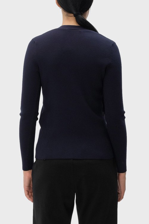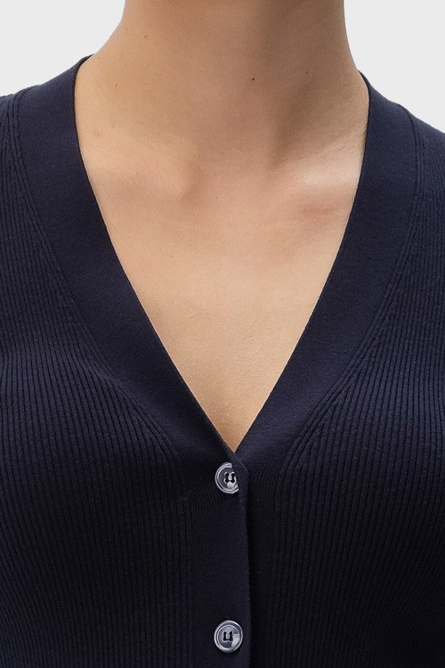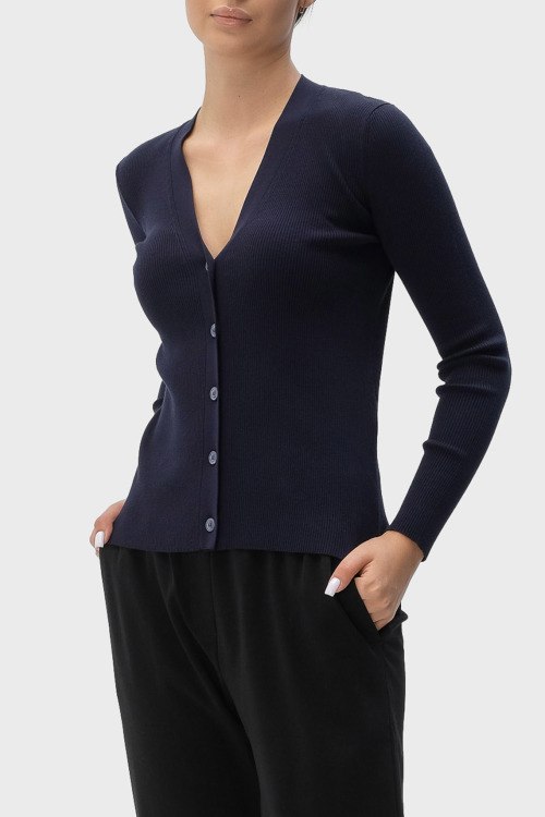 Детали: Женский темно-синий трикотажный кардиган Gabriel от Max Mara Weekend (Макс Мара Викенд). Дизайн в рубчик, V-образный вырез, застежка на пуговицы, классическая длина