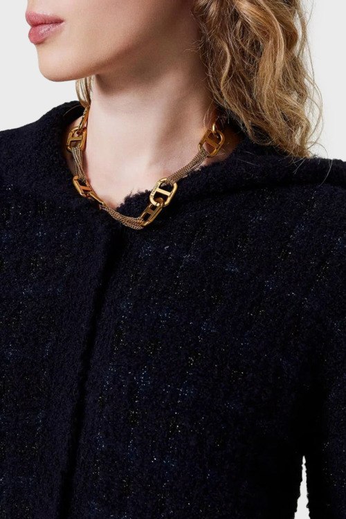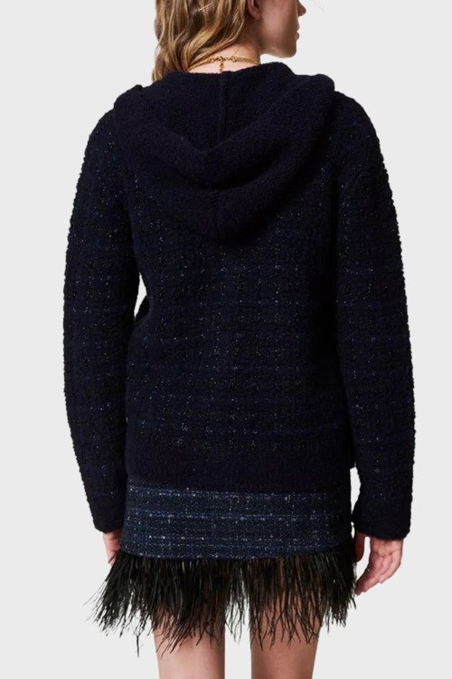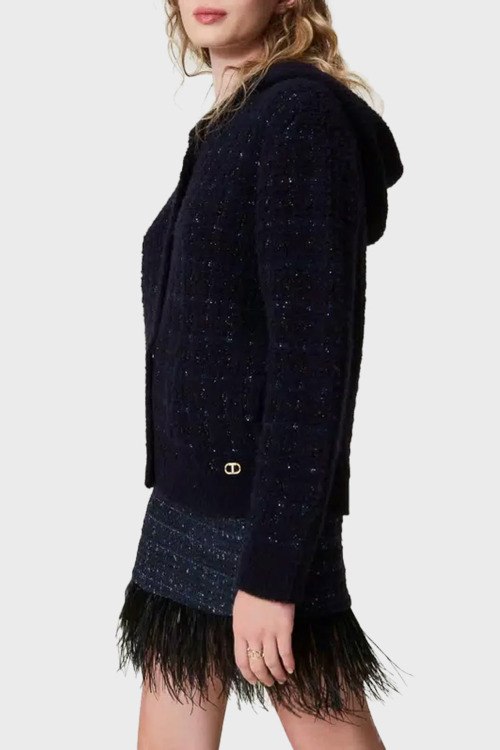 Детали: Женский темно-синий кардиган из полиамида, вискозы и шерсти от TWINSET (Твинсет). Вшитый капюшон, застежка на кнопки, длинные рукава, дизайн с люрексом