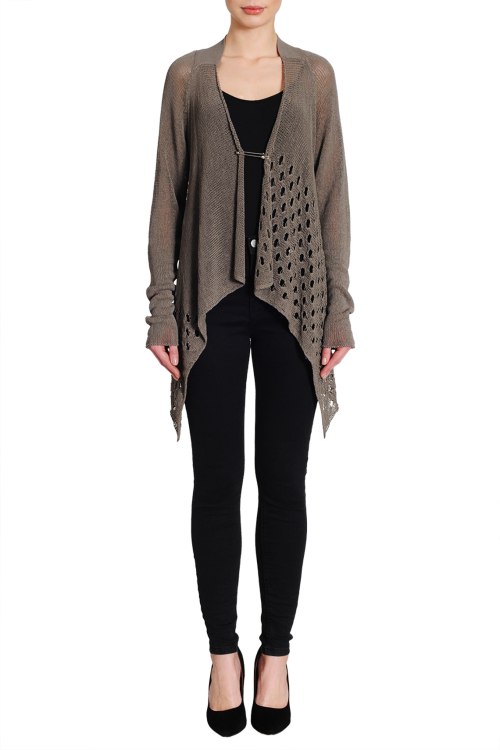 Детали: Однотонный кардиган асимметричного кроя, декорирован булавкой