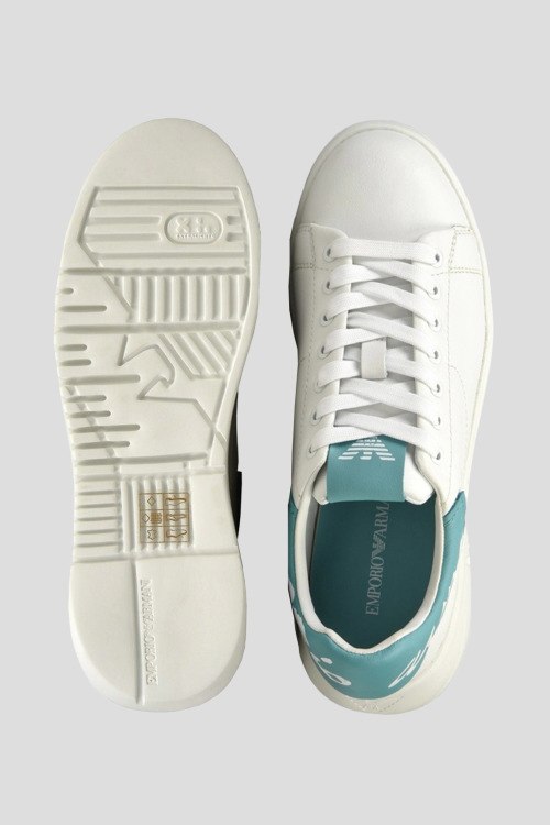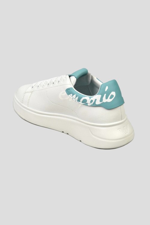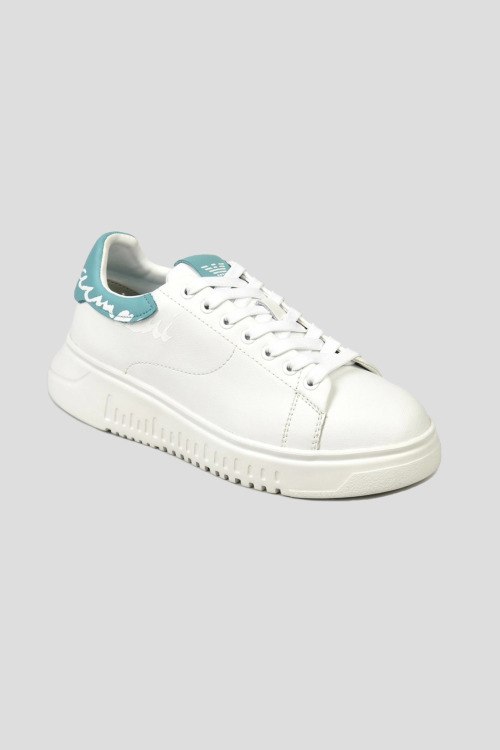 Детали: Женские белые кожаные кеды от Emporio Armani (Эмпорио Армани). Модель из гладкой кожи, контрастный задник с логотипом, нашивка с логотипом на язычке, классическая шнуровка, закругленный носок