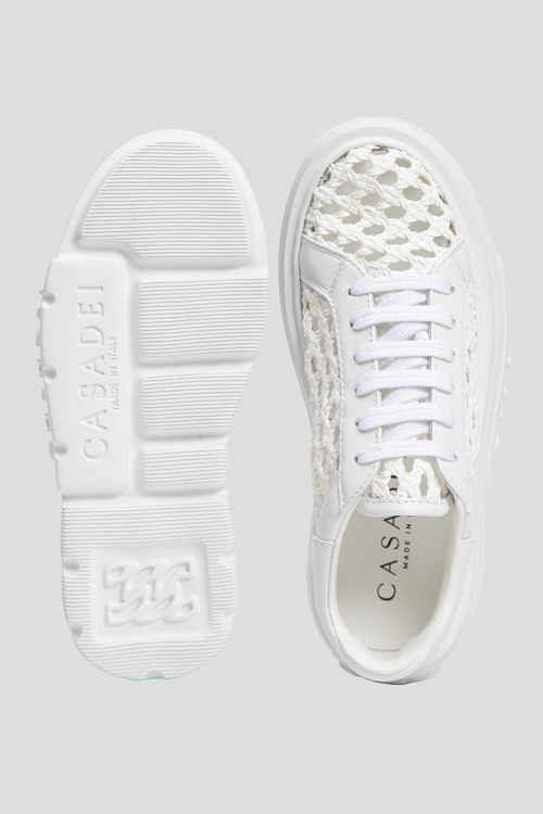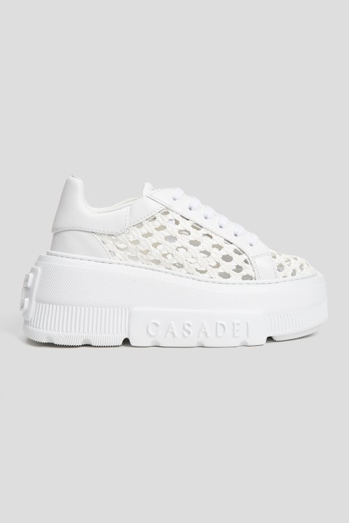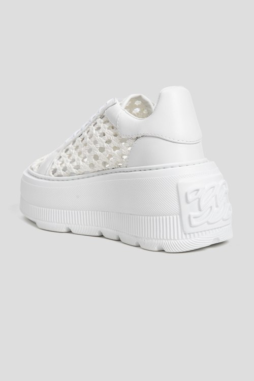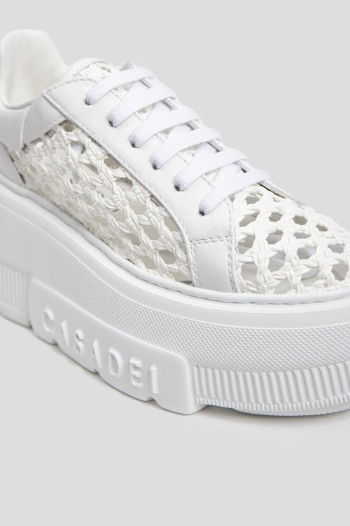 Детали: Женские белые кеды из натуральной кожи от Casadei (Касадей). Закругленный носок, плетенный дизайн с перфорацией, спереди классическая шнуровка, модель на платформе 8 см