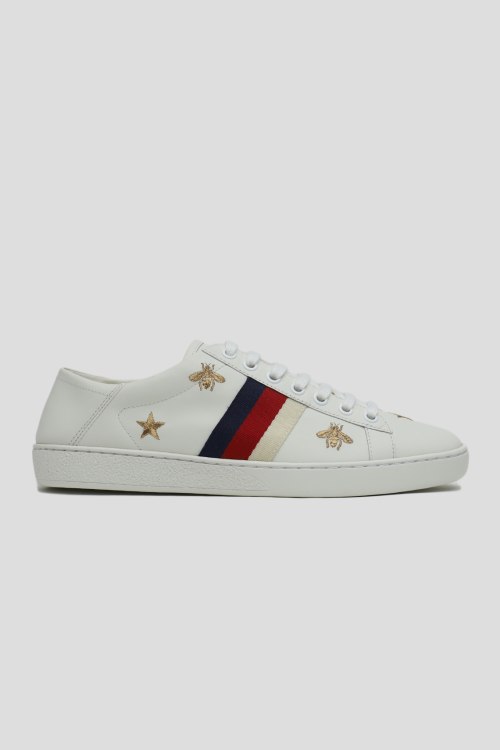 Женские белые кеды Ace из натуральной кожи от Gucci (Гуччи). Декорированы отделкой Web в синюю и красную полоску, дополнены узнаваемым символом Дома в виде пчелы золотистого цвета. Пчела — архивный символ Дома, впервые представленный Gucci в коллекции одежды в 70-е годы. Классическая шнуровка, закругленный носок, плоская белая подошва из каучука заканчивают эту композицию. Комплектация: фирменная коробка, два фирменных пыльника.
