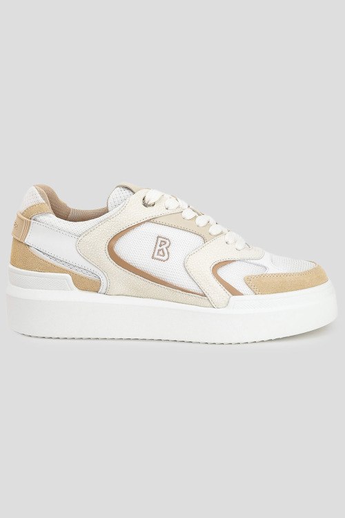 Детали: Женские бело-бежевые кеды из кожи и текстиля Hollywood от Bogner (Богнер). Комбинация цветов и материалов, логотип сбоку и на язычке, классическая шнуровка, закругленный носок, белая подошва