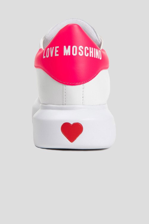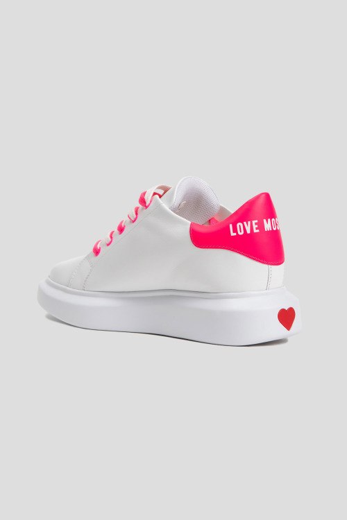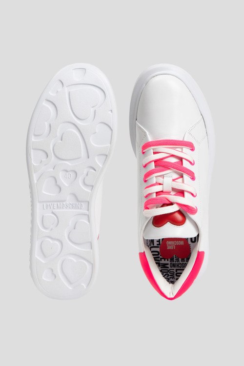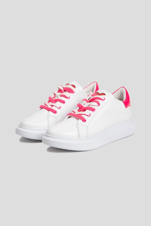 Детали: Женские розово-белые кеды из натуральной кожи от Love Moschino (Лав Москино). Закругленный носок, спереди шнуровка, контрастная вставка ан заднике с логотипом бренда, толстая резиновая подошва, дополнительные шнурки в комплекте