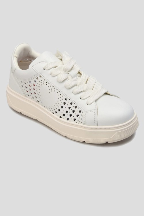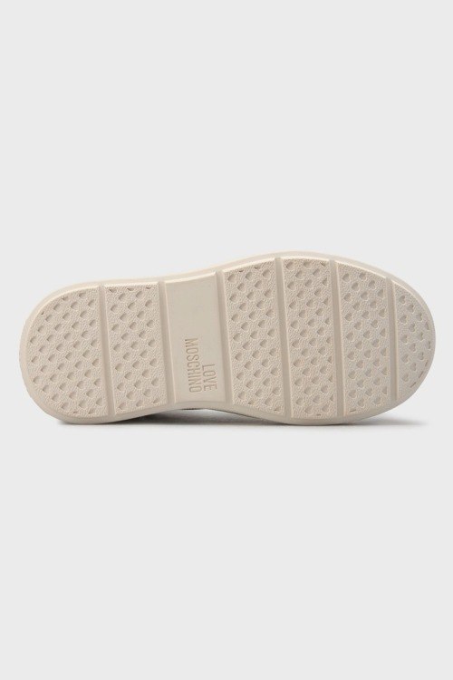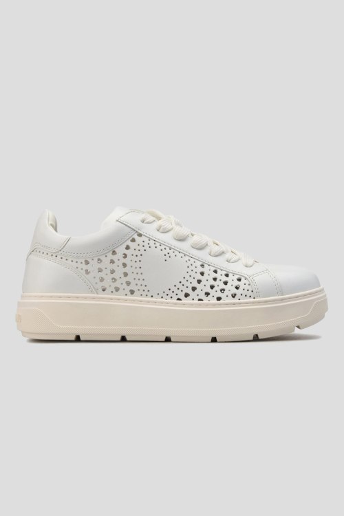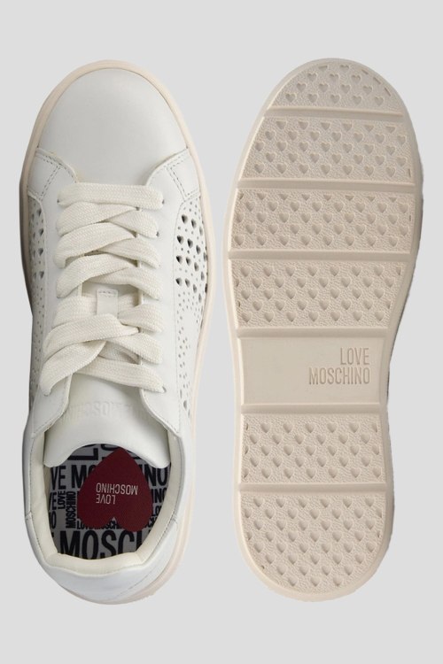 Детали: Женские белые кожаные кеды от Love Moschino (Лав Москино). Модель из гладкой кожи, дизайн с перфорацией, логотип на язычке, классическая шнуровка, закругленный носок. Подошва: 4 см