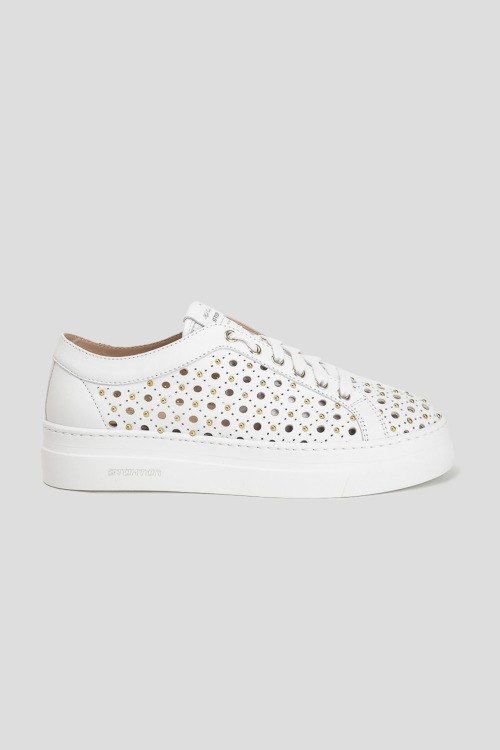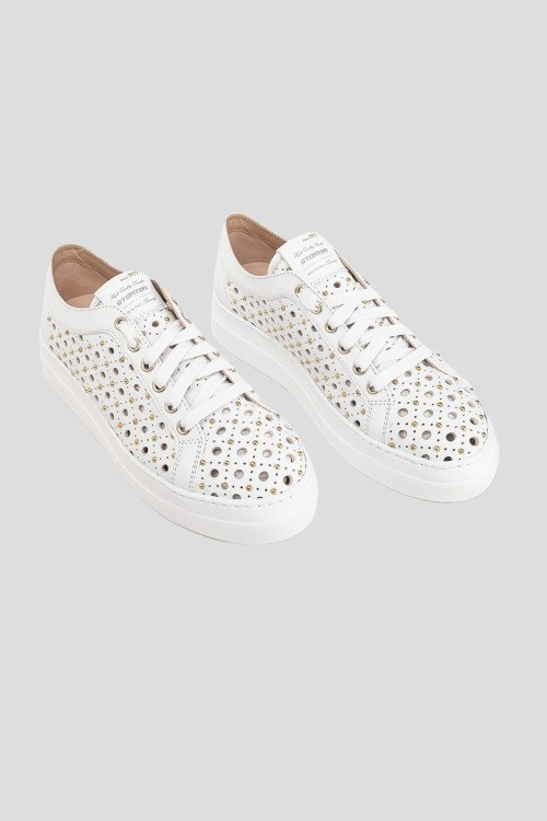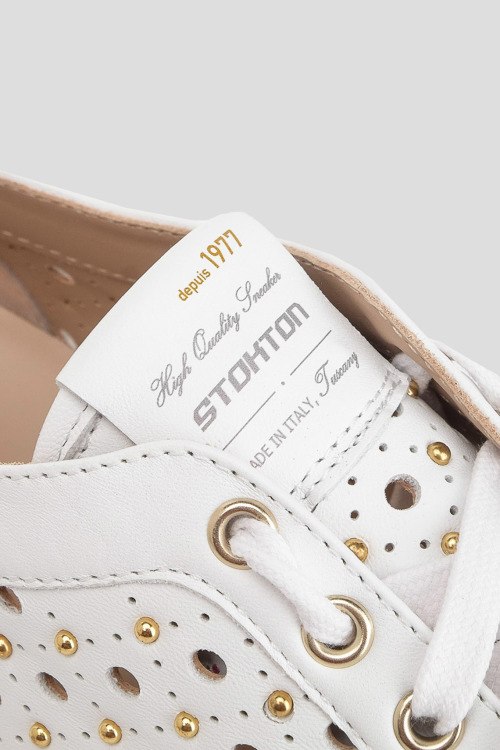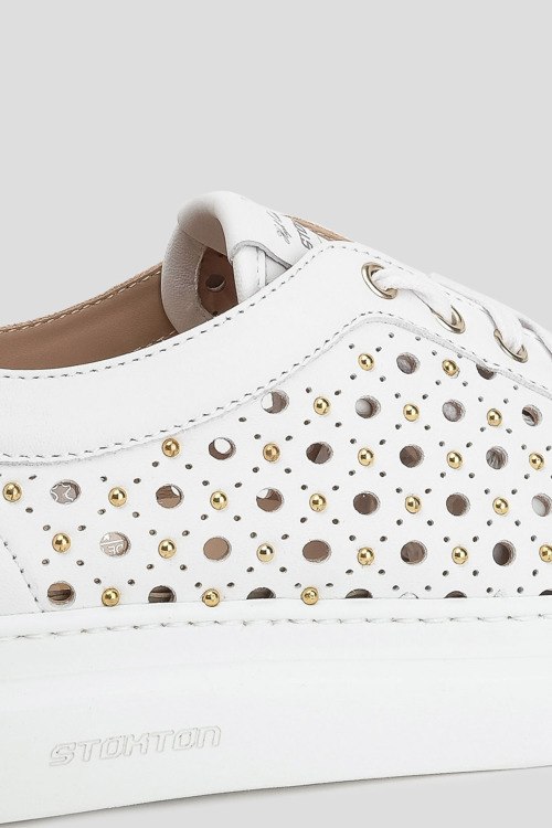 Детали: Женские белые кожаные кеды от Stokton (Стоктон). Модель из гладкой кожи, дизайн с перфорацией, декор заклепками, логотип на язычке, классическая шнуровка, закругленный носок, белая подошва