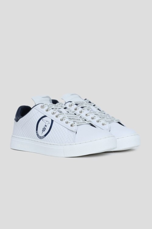Детали: Женские белые кеды из экокожи от Trussardi (Труссарди). Дизайн с тиснением, логотип сбоку и на пятке, закругленный носок, классическая брендированная шнуровка, плоская подошва