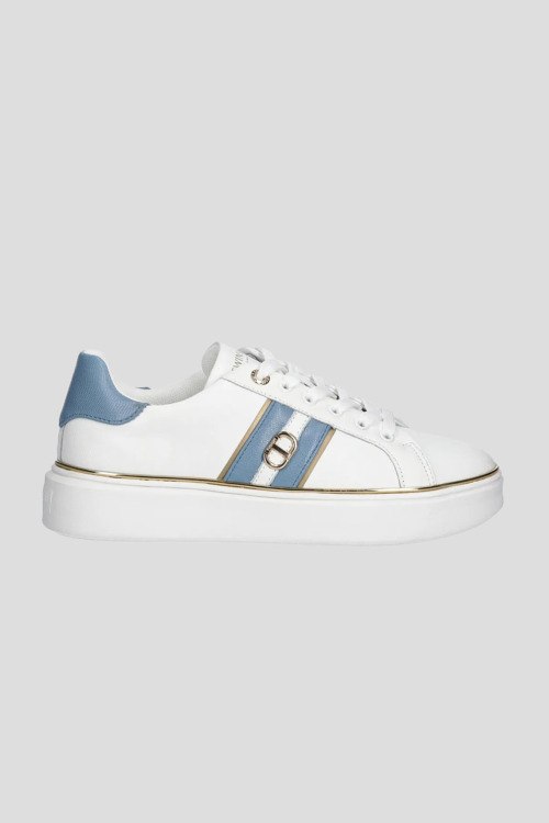 Детали: Женские белые кеды из экокожи от TWINSET (Твинсет). Модель из гладкой кожи, логотип сбоку и на язычке, голубые вставки, классическая шнуровка, закругленный носок, белая подошва