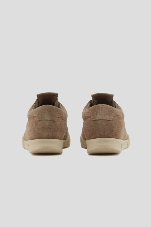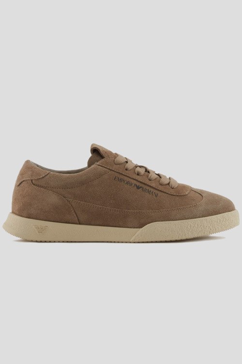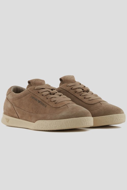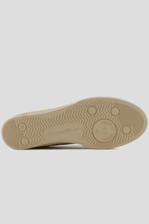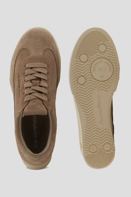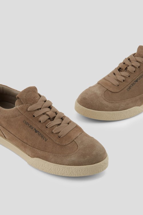 Детали: Женские бежевые кеды из натуральной замши от Emporio Armani (Эмпорио Армани). Закругленный носок, спереди шнуровка, тиснение с логотипом, резиновая подошва