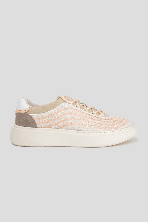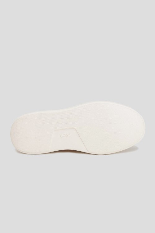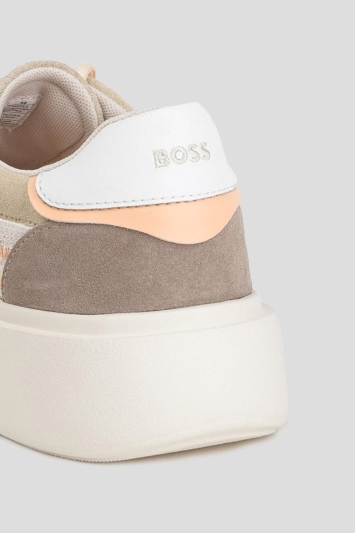 Детали: Женские бежевые кроссовки из текстиля от Hugo Boss (Хуго Босс). Закругленный носок, спереди классическая шнуровка, дизайн в виде комбинации цветов и материалов, патч-лого, толстая подошва