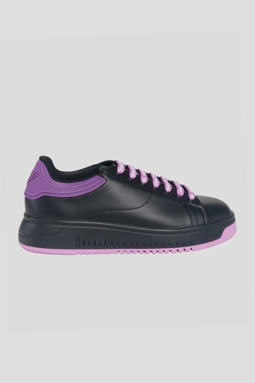 Детали: Женские черные кожаные кеды от Emporio Armani (Эмпорио Армани). Модель из гладкой кожи, фиолетовая вставка на пятке, брендированные шнурки, закругленный носок