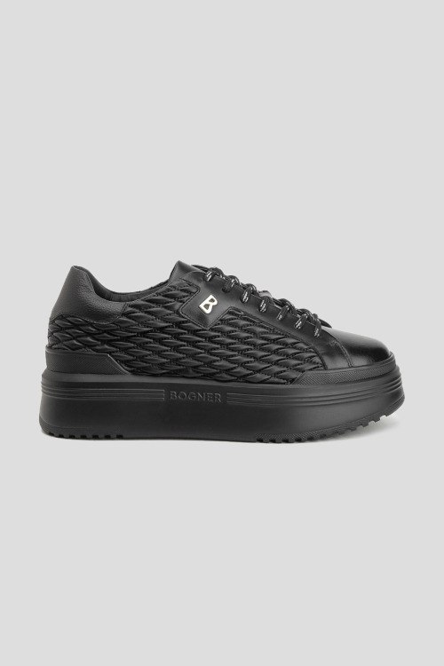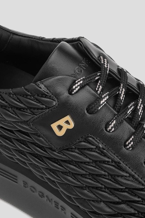 Детали: Женские черные кожаные кеды New York от Bogner (Богнер). Модель из гладкой кожи, стеганый дизайн, логотип сбоку и на язычке, классическая шнуровка, закругленный носок, брендированная подошва