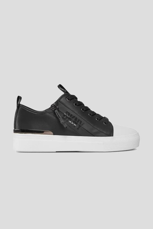 Детали: Женские черные кожаные кеды Chaney от Donna Karan (Донна Каран). Модель из гладкой кожи, классическая шнуровка, застежка-молния сбоку, две петли для подтягивания, закругленный носок, белая подошва