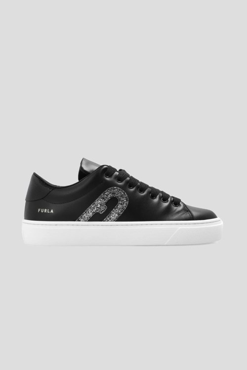 Детали: Женские черные кожаные кеды Joy от Furla (Фурла). Модель из гладкой кожи, логотип сбоку и на язычке, классическая шнуровка, закругленный носок, белая подошва