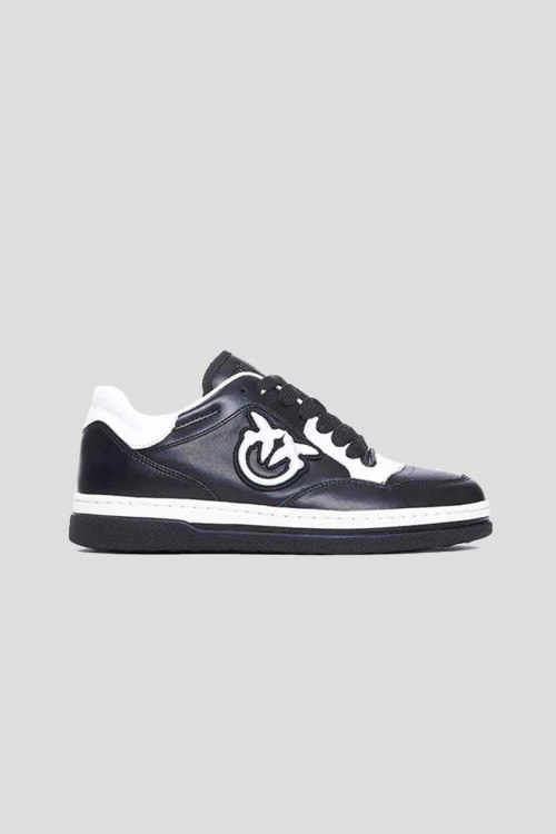 Детали: Женские черные кожаные кеды Mandy от Pinko (Пинко). Модель из гладкой кожи, белые вставки, логотип Love Birds, классическая шнуровка, закругленный носок, черно-белая подошва