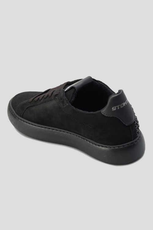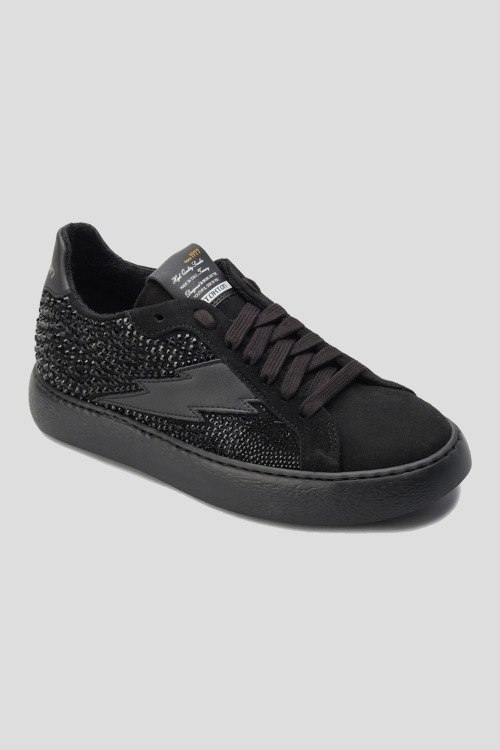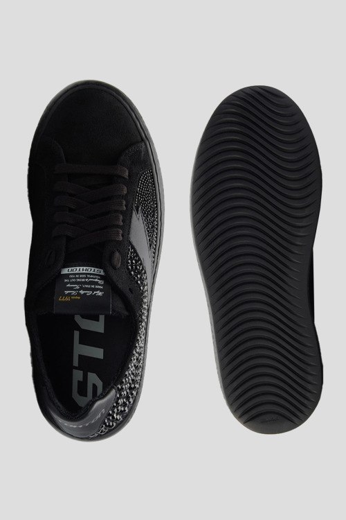 Детали: Женские черные замшевые кеды от Stokton (Стоктон). Декор кристаллами, логотип на язычке и на пятке, классическая шнуровка, закругленный носок, текстильная стелька