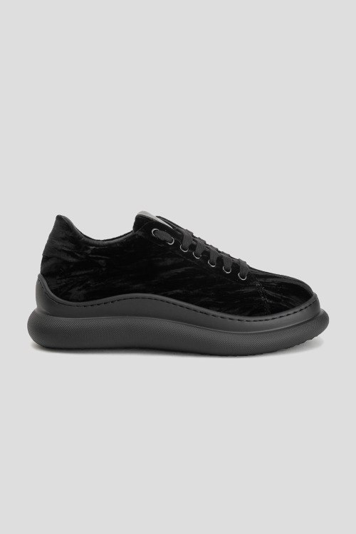 Детали: Женские черные велюровые кеды от Stokton (Стоктон). Нашивка с логотипом на язычке, классическая шнуровка, закругленный носок, черная подошва