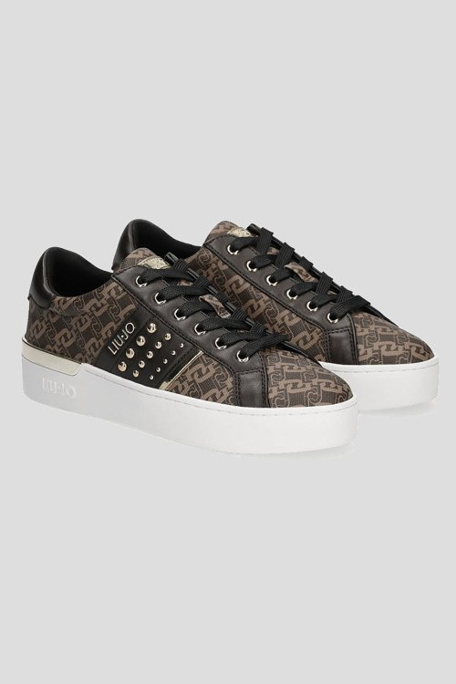 Детали: Женские коричневые кеды из экокожи Silvia 23 от Liu Jo (Лиу Джо). Принт с монограммой бренда, нашивка с логотипом на язычке, декор заклепками сбоку, классическая шнуровка, закругленный носок