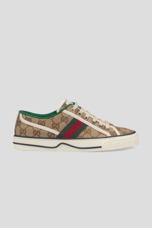 Детали: Женские коричневые кеды Tennis 1977 из канвы от Gucci (Гуччи). Закругленный носок, дизайн с монограммой по всей поверхности изделия, контрастные вставки, спереди классическая шнуровка, резиновая подошва, патч-лого
