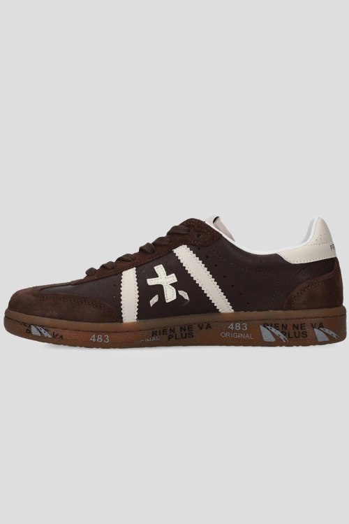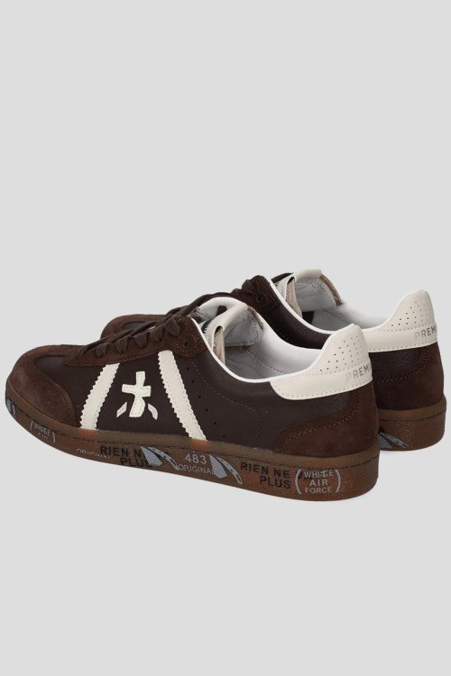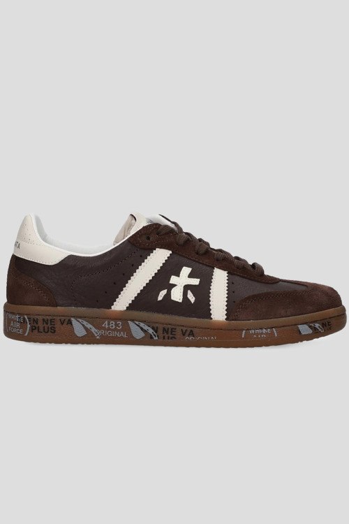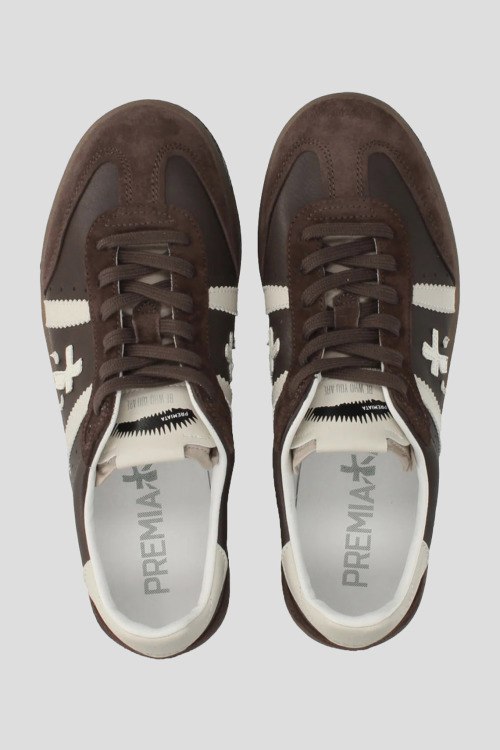 Детали: Женские коричневые кеды из кожи и замши от Premiata (Премиата). Комбинированный дизайн, закругленный носок, спереди классическая шнуровка, резиновая подошва, контрастные вставки, логотип бренда