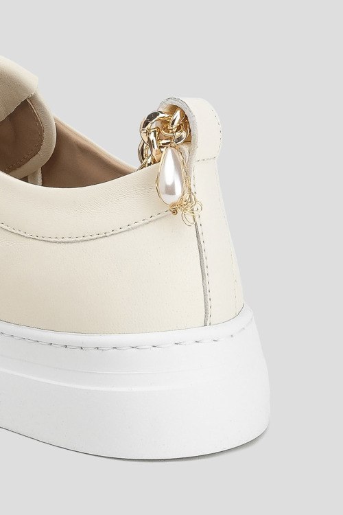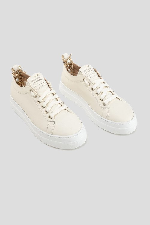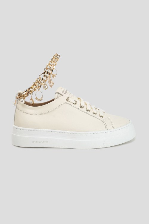 Детали: Женские кожаные кеды молочного оттенка от Stokton (Стоктон). Модель из гладкой кожи, золотистый браслет с подвесками на щиколотке, логотип на язычке, классическая шнуровка, закругленный носок, белая подошва