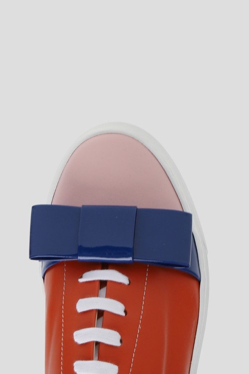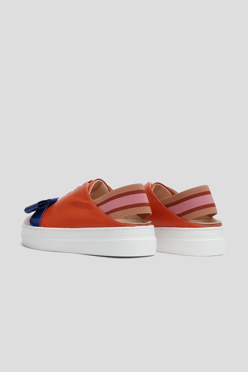 Женские оранжевые кеды из кожи от Camerlengo (Камерленго). Комбинированный дизайн, миндалевидный носок, резиновая высокая подошва, открытый задник с эластичным ремешком, спереди шнуровка, бант синего цвета, кожаная стелька с логотипом бренда. Измерения: высота подошвы: 3,5 см (на размер 36)