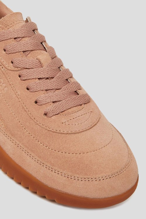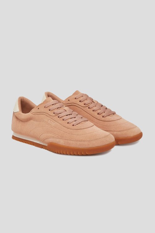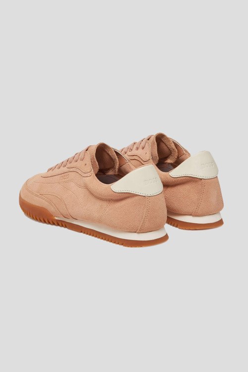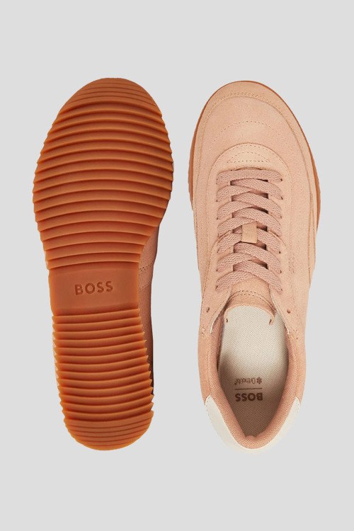 Детали: Женские персиковые кеды Carlynn Lowp из замши от Hugo Boss (Хуго Босс). Закругленный носок, спереди классическая шнуровка, рельефная подошва