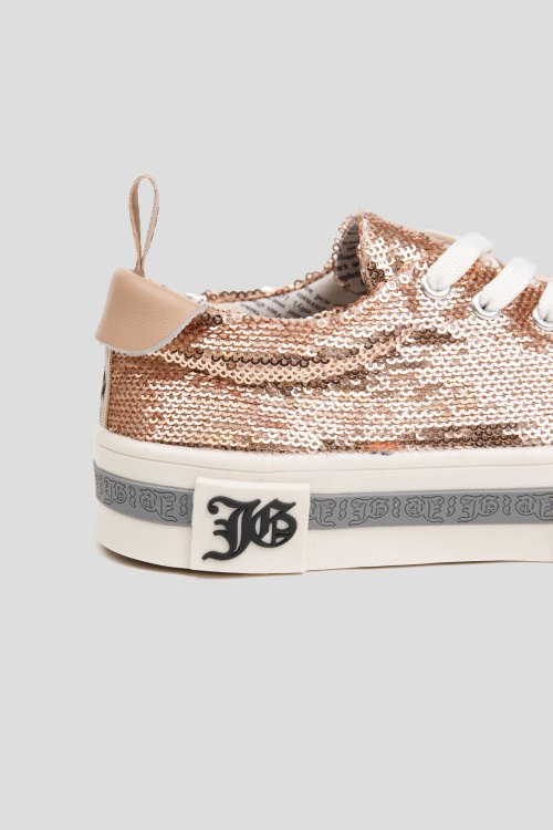 Детали: Женские пудровые кеды из текстиля от John Galliano (Джон Гальяно). Закругленный носок, спереди классическая шнуровка, резиновая подошва, петля для подтягивания, дизайн в пайетках по всей поверхности