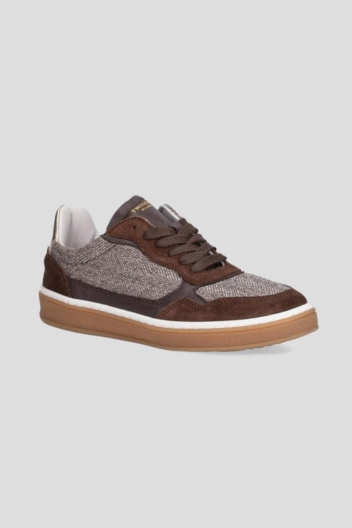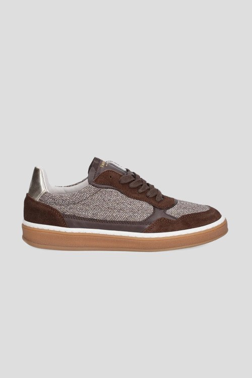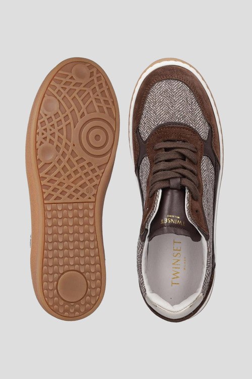 Детали: Женские серо-коричневые кеды из замши и текстиля от TWINSET (Твинсет). Комбинация цветов и материалов, логотип на язычке, классическая шнуровка, закругленный носок, бежевая подошва