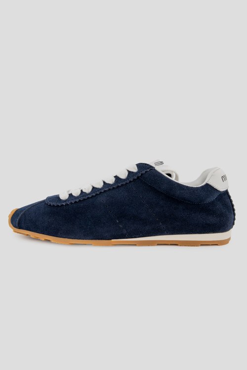 Детали: Женские темно-синие замшевые кеды Plume от Miu Miu (Миу Миу). Логотип на язычке и на пятке, классическая шнуровка, закругленный носок, кожаная стелька