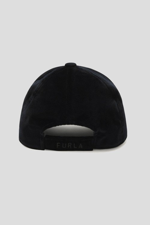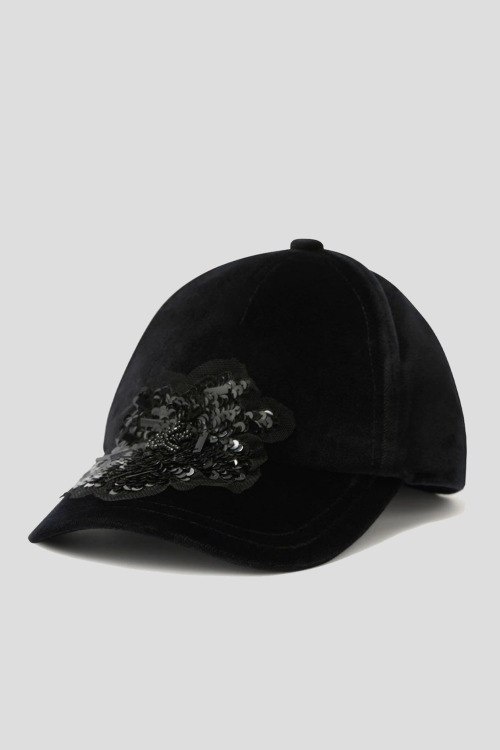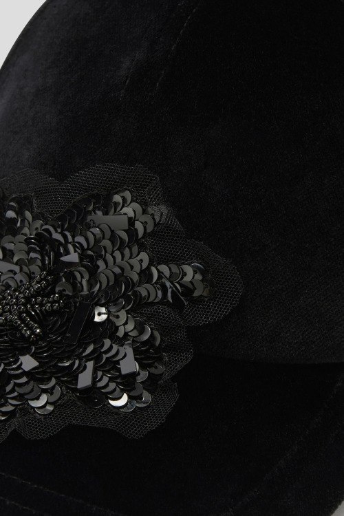 Детали: Женская черная велюровая кепка Varsity от Furla (Фурла). Нашивка из пайеток, закругленный козырек, регулируемый диаметр