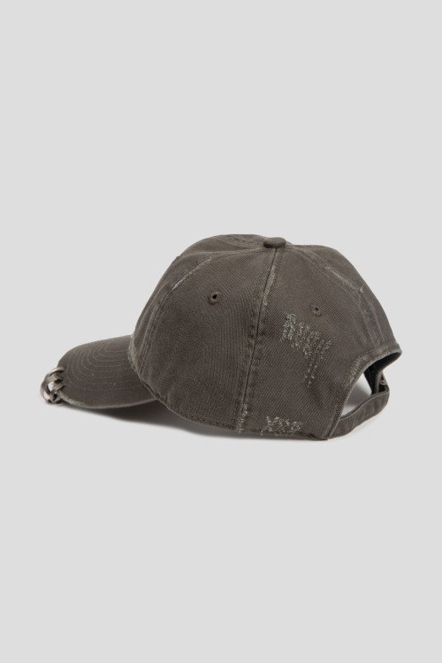 Детали: Женская кепка цвета хаки из хлопка от Balenciaga (Баленсиага). Закругленный козырек, регулируемая застежка, спереди вышивка логотипа, металлические кольца, продетые через край козырька, потертости