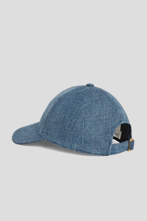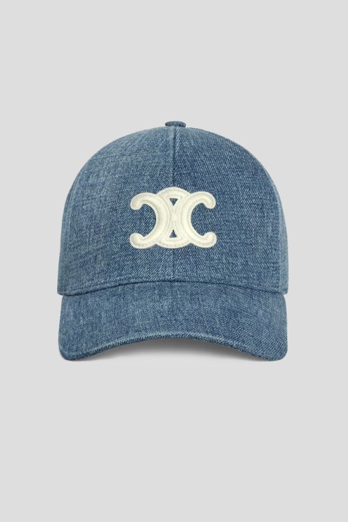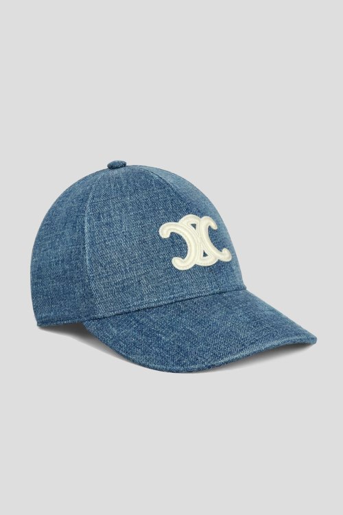 Женская синяя джинсовая кепка Triomphe от Celine (Селин). Модель в цвете Union Wash, нашивка с патч-лого, закругленный козырек, регулируемый диаметр