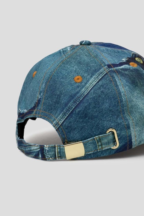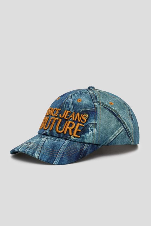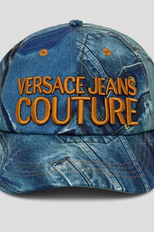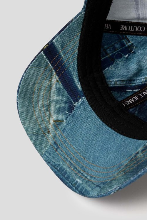 Детали: Женская синяя кепка из хлопка от Versace Jeans Couture (Версаче Джинс Кутюр). Дизайн с принтом по все поверхности изделия, перфорация, вышитый логотипом бренда
