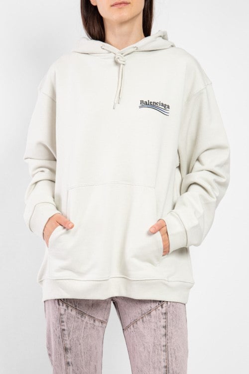 Белый хлопковый худи унисекс от Balenciaga (Баленсиага). Фасон oversize, капюшон на завязках, вышитый логотип на груди и на спине, карман-кенгуру, трикотажные манжеты и нижний край, удлиненная длина.