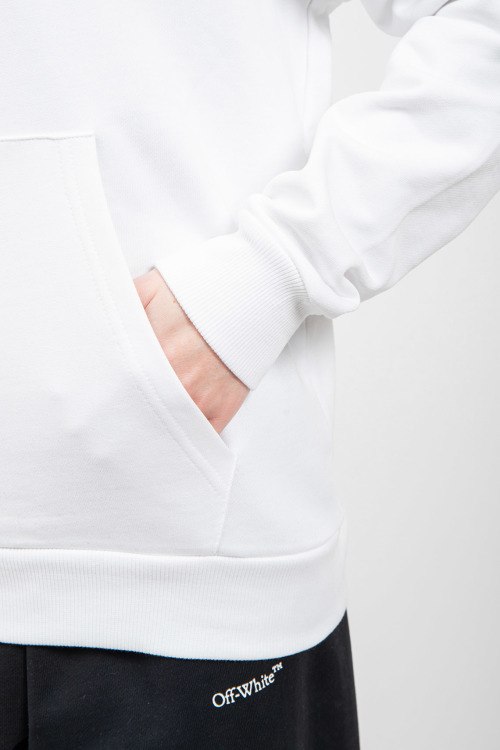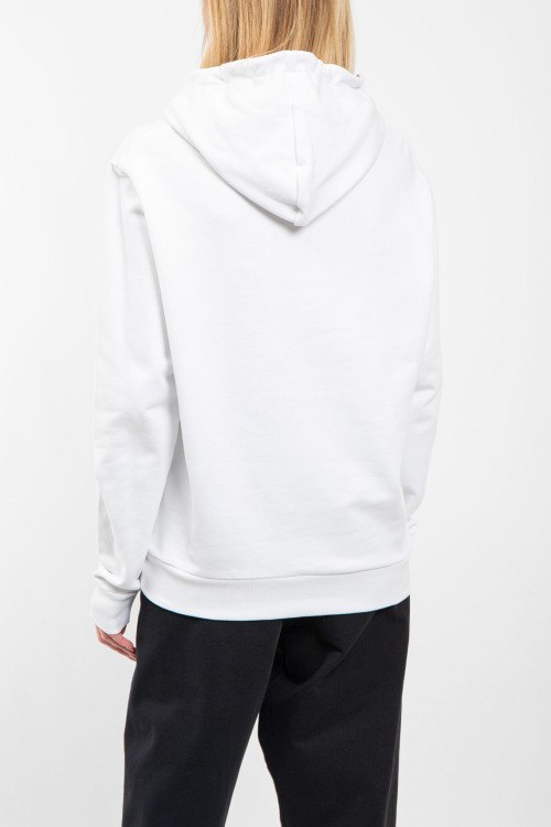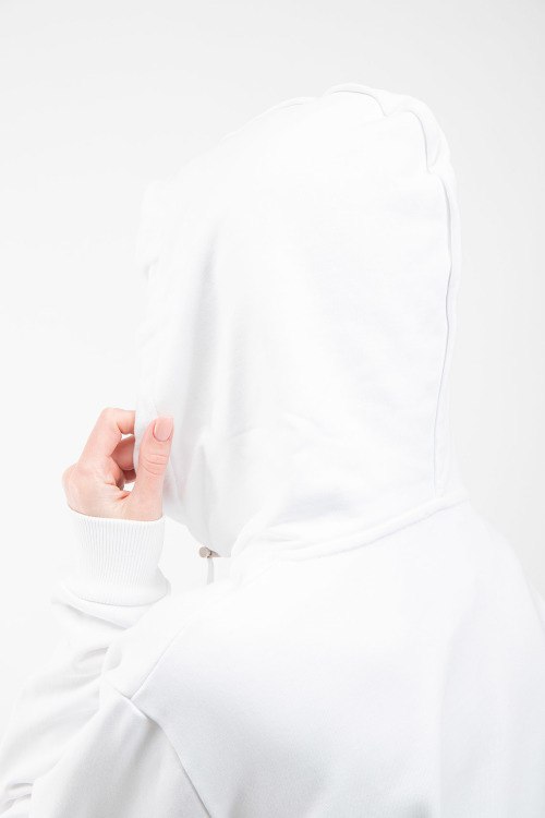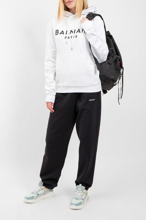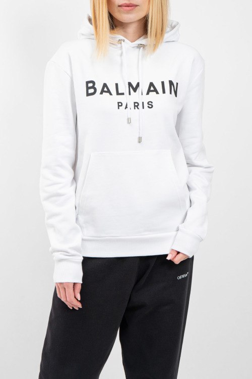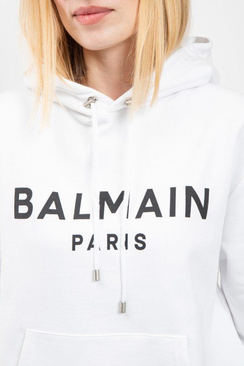 Женский белый хлопковый худи от Balmain (Бальман). Капюшон на завязках, логотип на груди, карман-кенгуру, классическая длина, трикотажные манжеты и нижний край.
