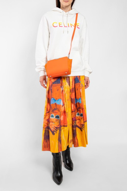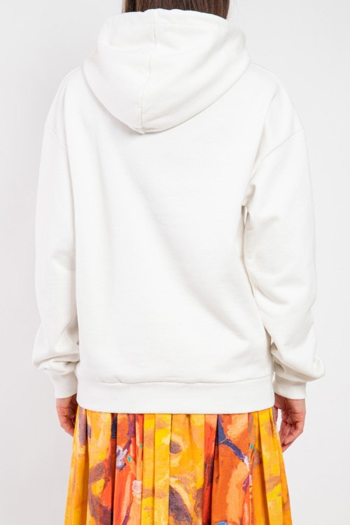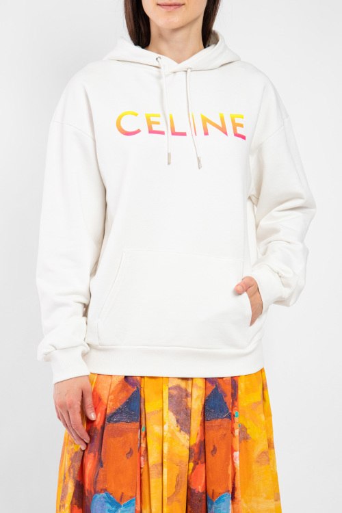 Белый хлопковый худи унисекс от Celine (Селин). Капюшон на завязках, принт с логотипом на груди, карман-кенгуру, трикотажные манжеты и нижний край, классическая длина.