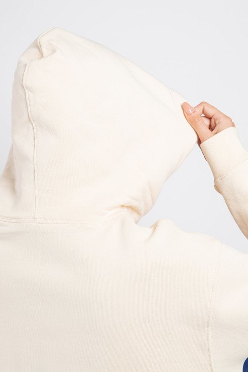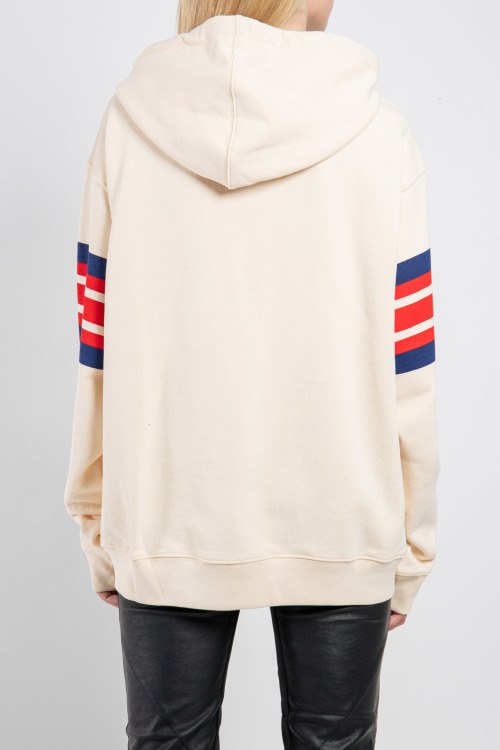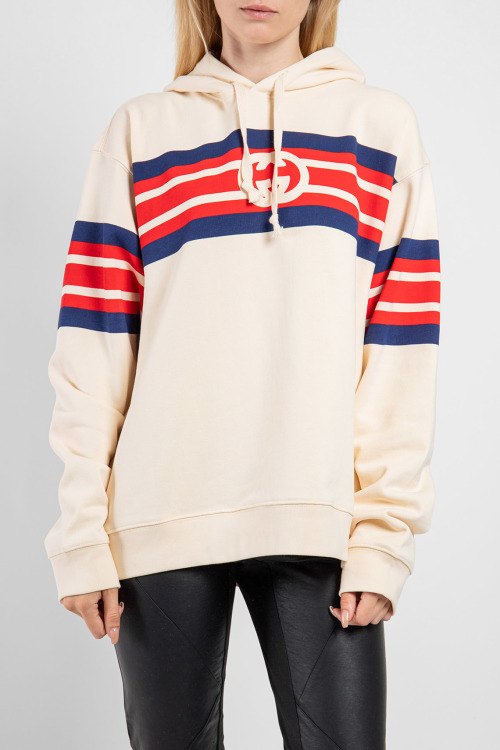 Женский худи из хлопка молочного оттенка от Gucci (Гуччи). Модель unisex. Длинные рукава, капюшон с кулиской на шнурке. Спереди карман-кенгуру, низ и манжеты - в рубчик. Декор: принт сине-бело-красные полосы и логотип на груди. Размер вещи на фото: L