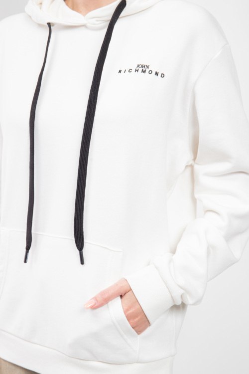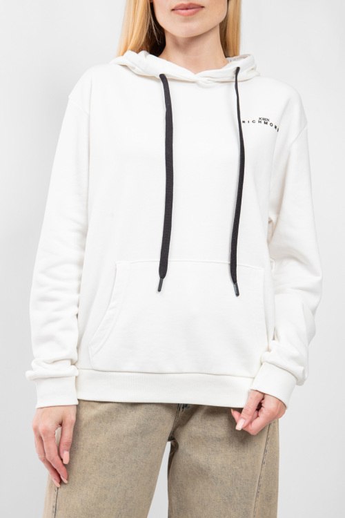 Женский белый хлопковый худи от John Richmond (Джон Ричмонд). Капюшон на завязках, логотип на груди, карман-кенгуру, классическая длина, трикотажные манжеты и нижний край. Размер вещи на фото: S, длина спереди: 66 см, ширина по груди: 62 см, ширина по талии: 54 см, ширина по бёдрам 48 см, длина рукава: 55 см, ширина рукава: 20 см.