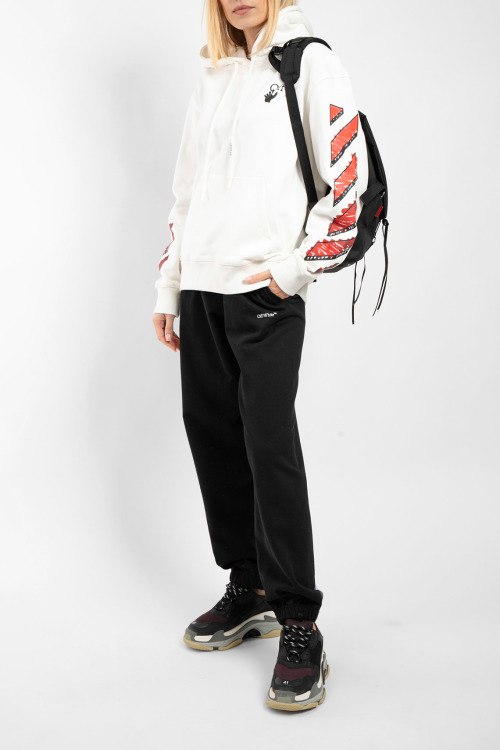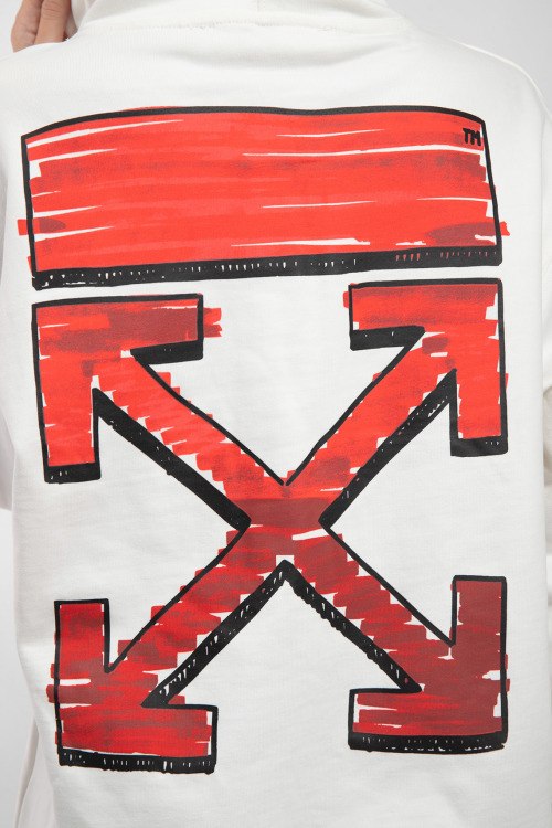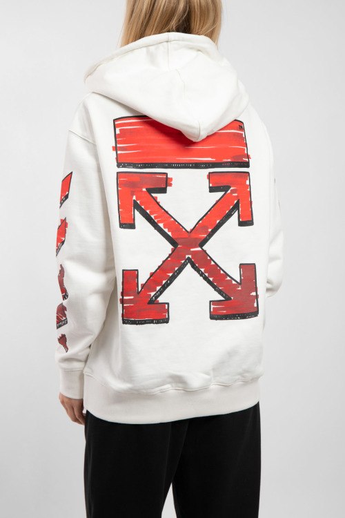 Детали: Женский белый хлопковый худи от Off-White (Офф-Вайт). Капюшон на завязках, принт с логотипом на груди и на спине, принт на рукавах, карман-кенгуру, классическая длина, трикотажные манжеты и нижний край