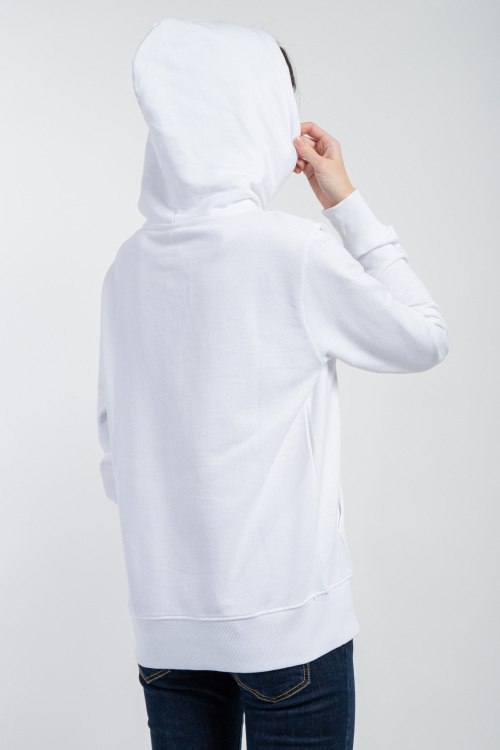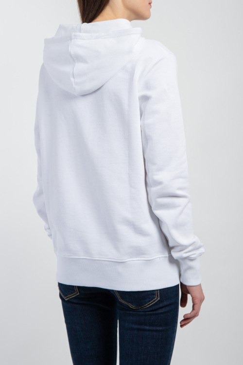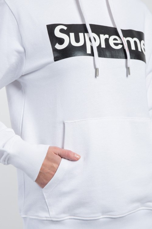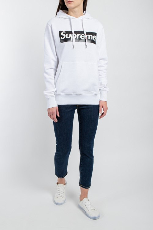 Женский белый хлопковый худи от Supreme Spain (Суприм Спейн). Классическая длина, вшитый капюшон с кулиской, длинные рукава, трикотажная резинка на манжетах и по низу изделия, спереди карман-кенгуру, принт с логотипом бренда на груди.