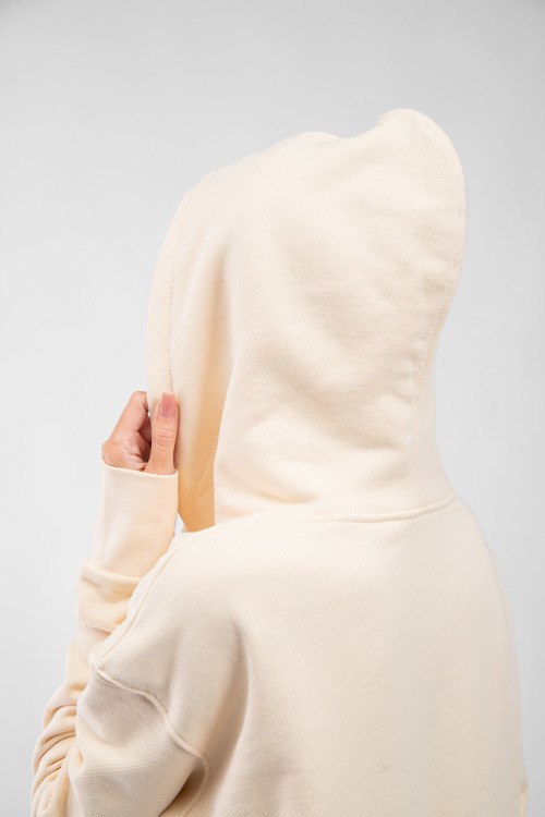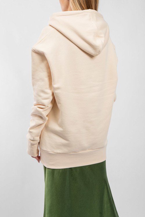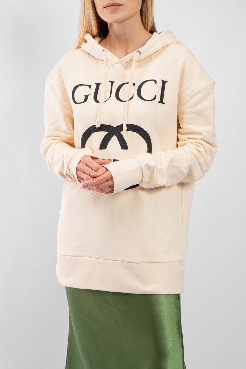 Женский светло-бежевый хлопковый худи от Gucci (Гуччи). Фасон oversize, логотип на груди, капюшон на завязках, удлиненная длина, трикотажные манжеты и нижний край.