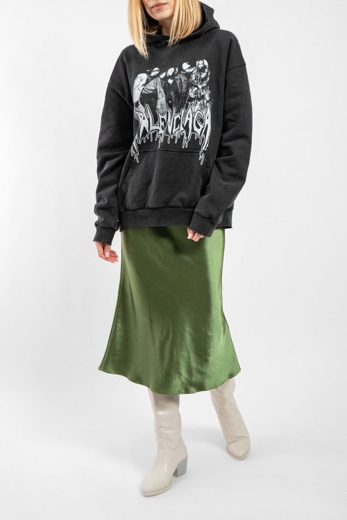 Женский черный хлопковый худи от Balenciaga (Баленсиага). Принт с логотипом спереди, фасон oversize, вшитый капюшон, карман-кенгуру, классическая длина, трикотажные манжеты и нижний край.