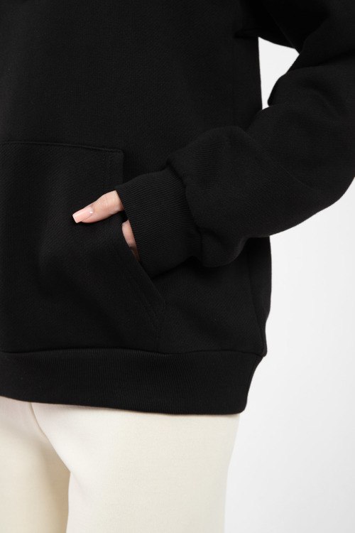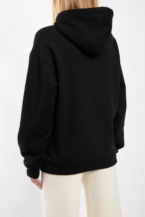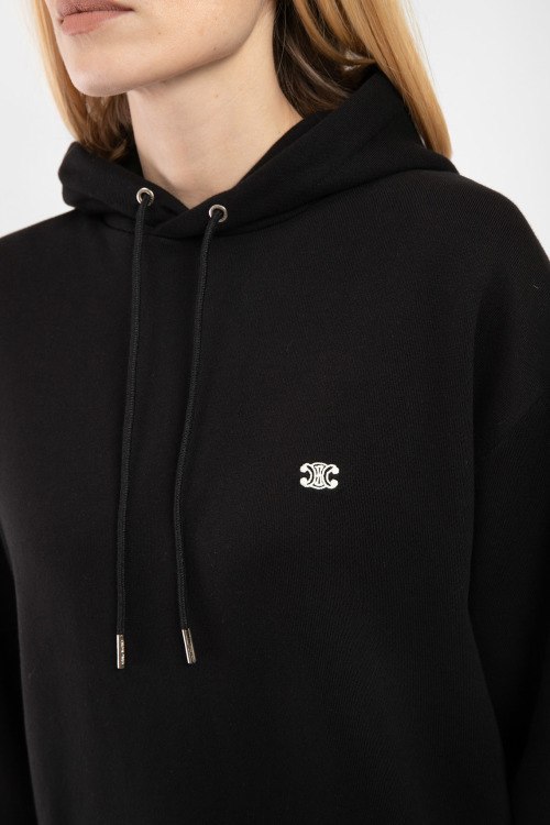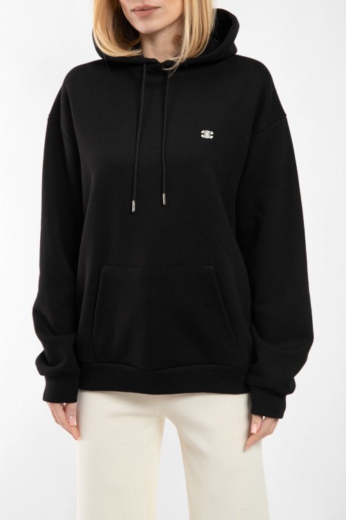 Женский черный хлопковый худи от Celine (Селин). Капюшон на завязках, вышитый логотип на груди, карман-кенгуру, классическая длина, трикотажные манжеты и нижний край.