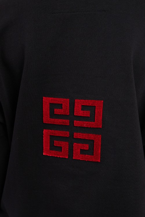 Черный хлопковый худи унисекс от Givenchy (Живанши). Фасон oversize, капюшон на завязках, вышитый логотип на груди и на спине, карман-кенгуру, трикотажные манжеты и нижний край, удлиненная длина