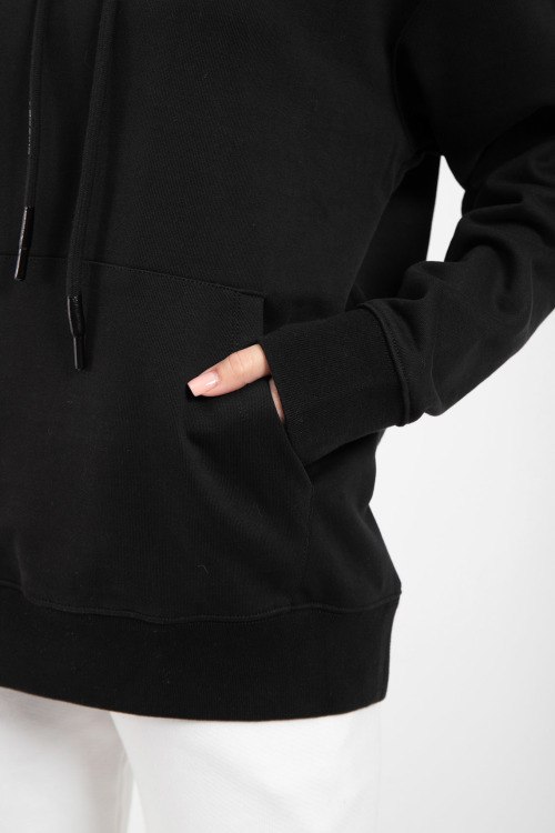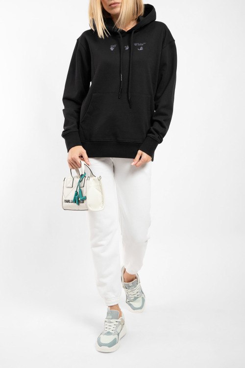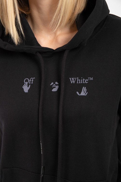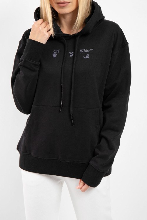 Детали: Женский черный хлопковый худи от Off-White (Офф-Вайт). Капюшон на завязках, принт с логотипом на груди и на спине, карман-кенгуру, классическая длина, трикотажные манжеты и нижний край