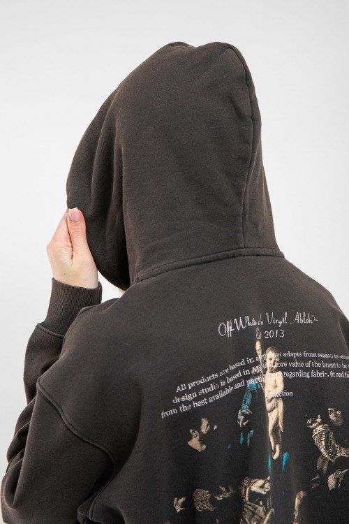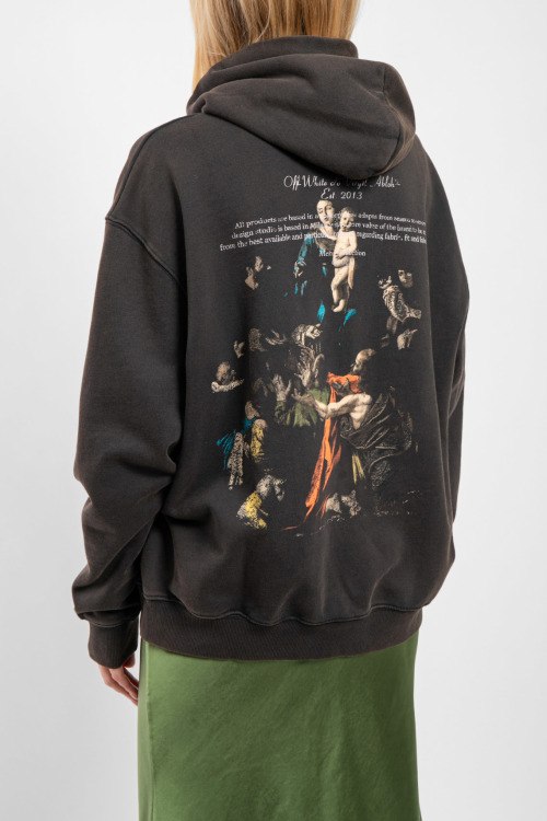 Женский черный хлопковый худи от Off-White (Офф-Вайт). Принт спереди и сзади, фасон oversize, капюшон на завязках, карман-кенгуру, классическая длина, трикотажные манжеты и нижний край.