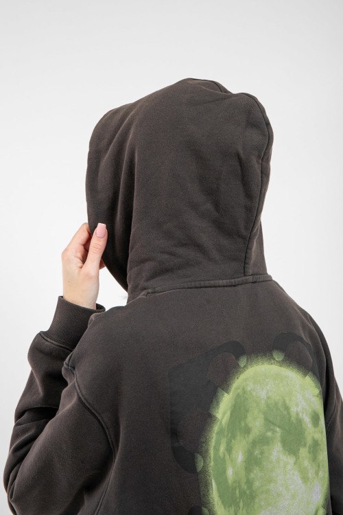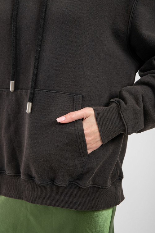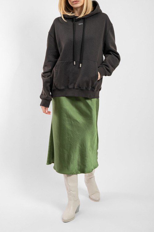 Женский черный хлопковый худи от Off-White (Офф-Вайт). Принт спереди и сзади, фасон oversize, капюшон на завязках, карман-кенгуру, трикотажные манжеты и нижний край.