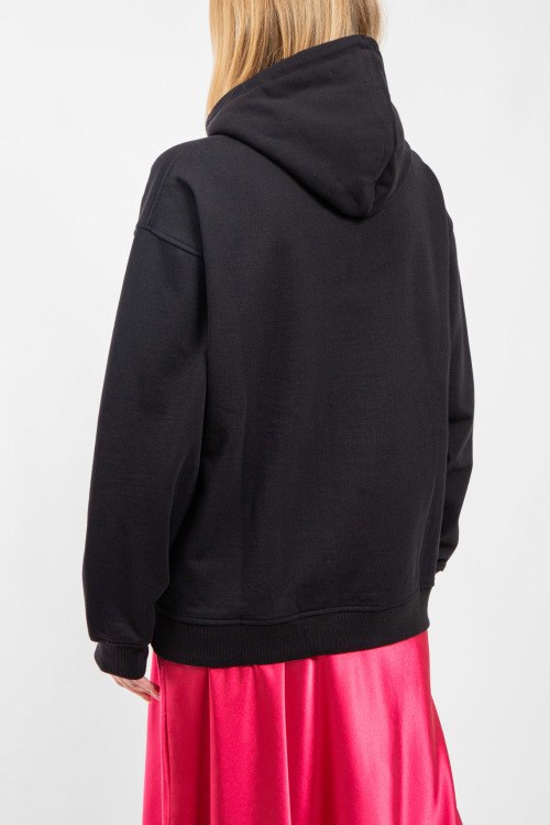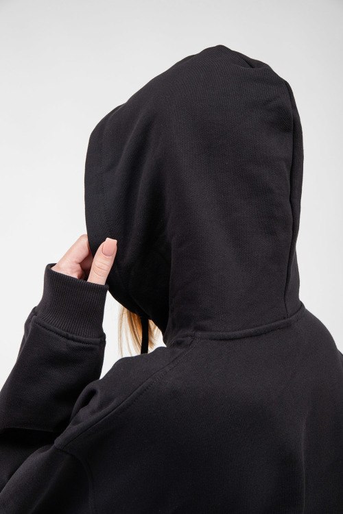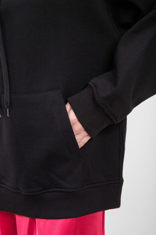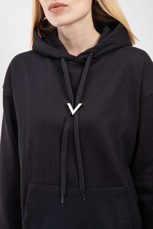 Женский черный худи из хлопка от Valentino (Валентино). Фасон oversize, вшитый капюшон с кулиской, длинные рукава, манжеты и низ изделия на трикотажной резинке, карман-кенгуру. Замеры для размера на фото: S; длина - 67 см; ПОГ - 58 см; ПОТ - 56 см; ПОБ - 53,5 см; длина по внутреннему шву рукава - 49 см; ширина рукава - 25,5 см.
